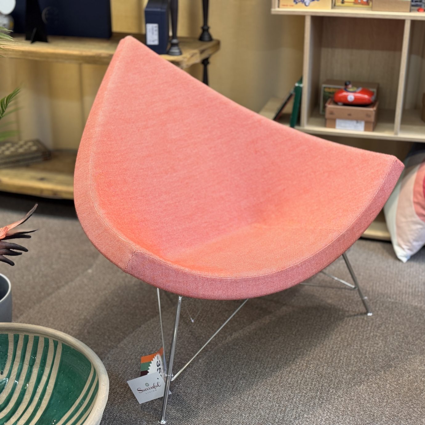 La chaise Coconut de George Nelson a été conçue en 1950 et renvoie au design de l'époque avec des formes claires et une charmante apparence minimaliste. Le piètement en tube d'acier chromé supporte une coque rembourrée qui, selon George Nelson, illustrait la coque d'une noix de coco. La chaise Coconut est un classique du design et est aujourd'hui éditée par Vitra. Elle procure une touche décalée rappelant le milieu du siècle moderne.