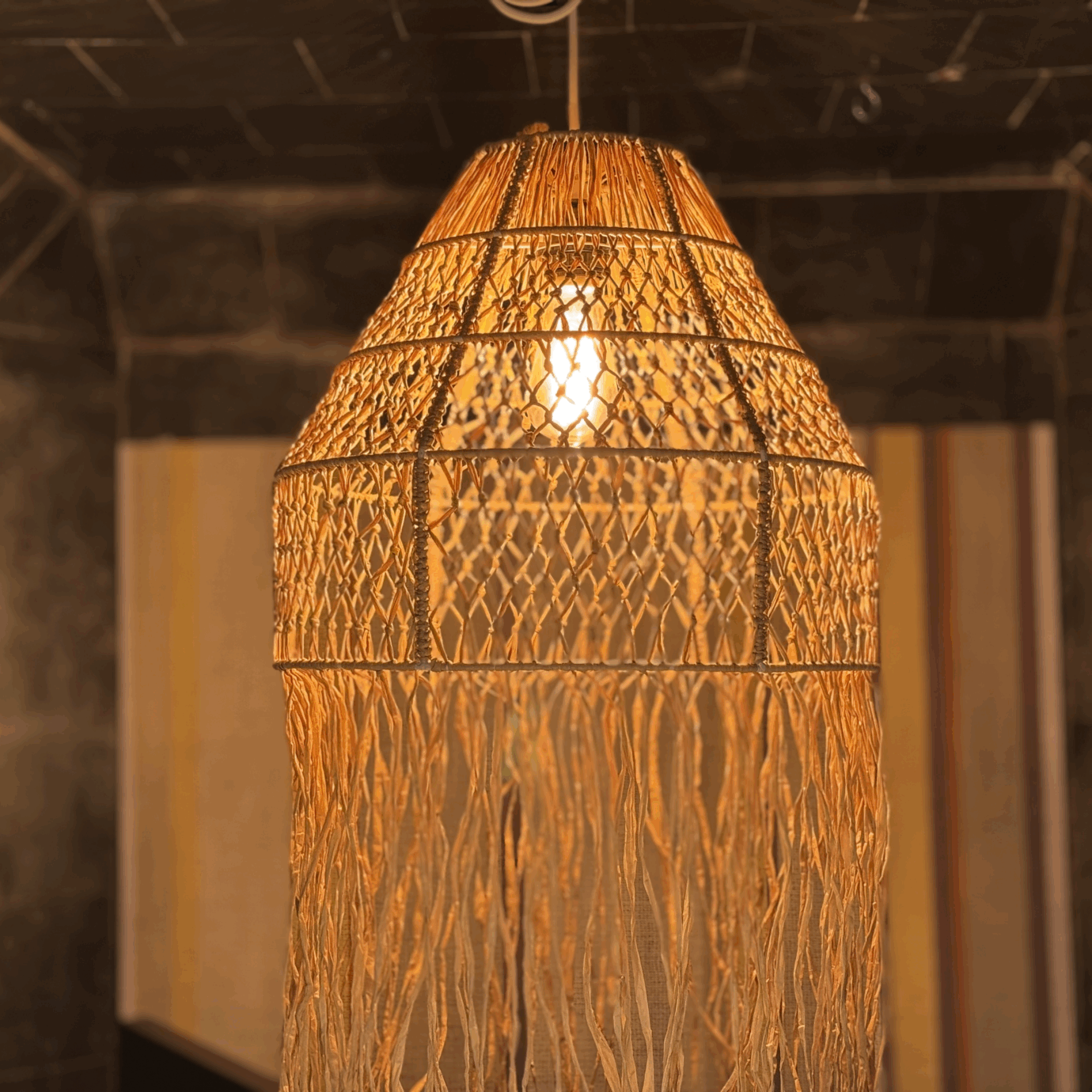 Le dessous de la lampe est orné de longues queues qui donnent l'impression que la structure tressée est enroulée.