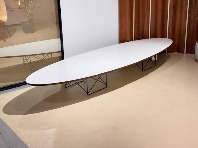 L'élégante et imposante table basse ETR de Charles et Ray Eames est disponible avec un plateau noir ou blanc et un piètement en fil d'acier thermolaqué. Grâce à sa forme elliptique, elle a rapidement été surnommée « table de surf ».