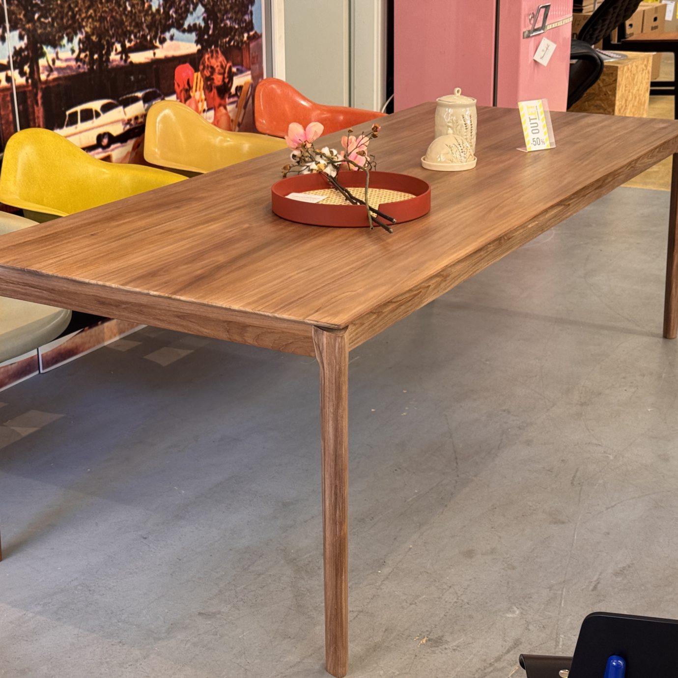 Cette table, conçue pour un intérieur décontracté et raffiné, complète parfaitement tout espace de vie. À première vue, la table est simple, mais avec sa silhouette étonnante et son bois chaleureux, elle s’intègre idéalement dans presque tous les espaces de vie ou de bureau. Elle est fabriquée dans un magnifique bois de chêne massif. Le célèbre fabricant belge Ethnicraft a choisi du chêne européen pour cette table, car les nœuds et les fentes y sont encore visibles. Chaque table est donc unique et intemporelle!